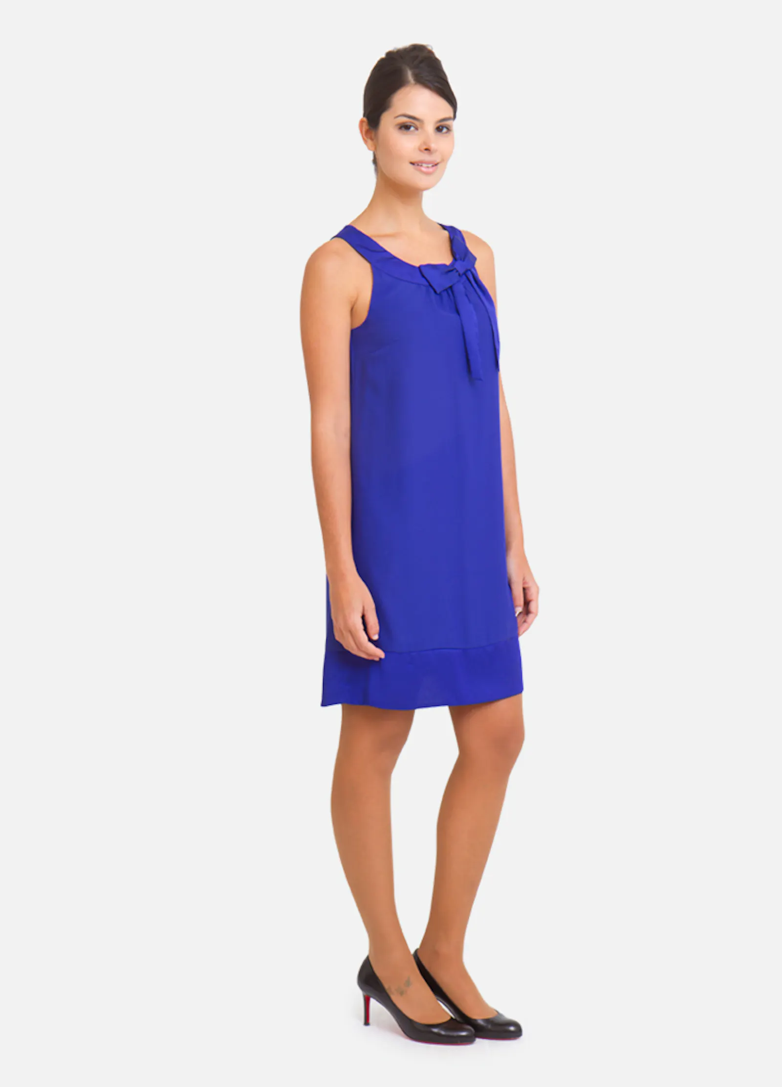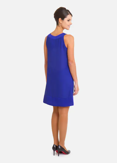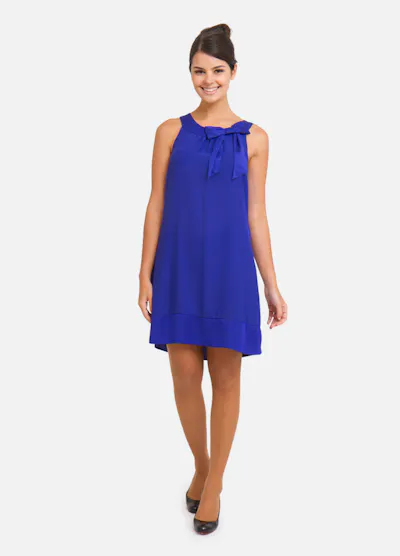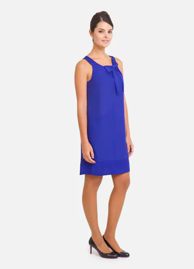 • Robe bleu électrique légère et fluide, coupe trapèze, sans manches, le col est arrondi avec un petit nœud sur le côté.