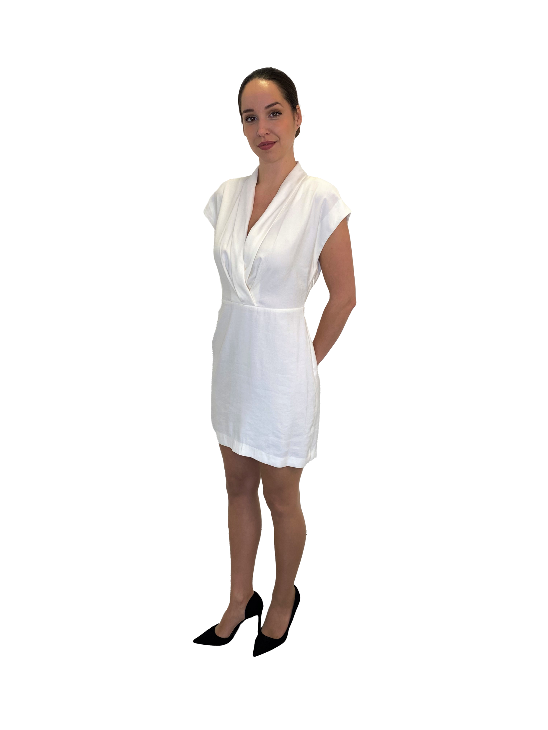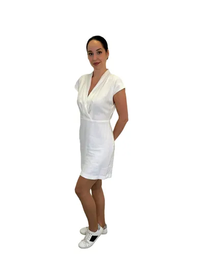 • Robe écru près du corps, courte. Col en V. Fermeture Éclair latérale.