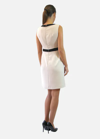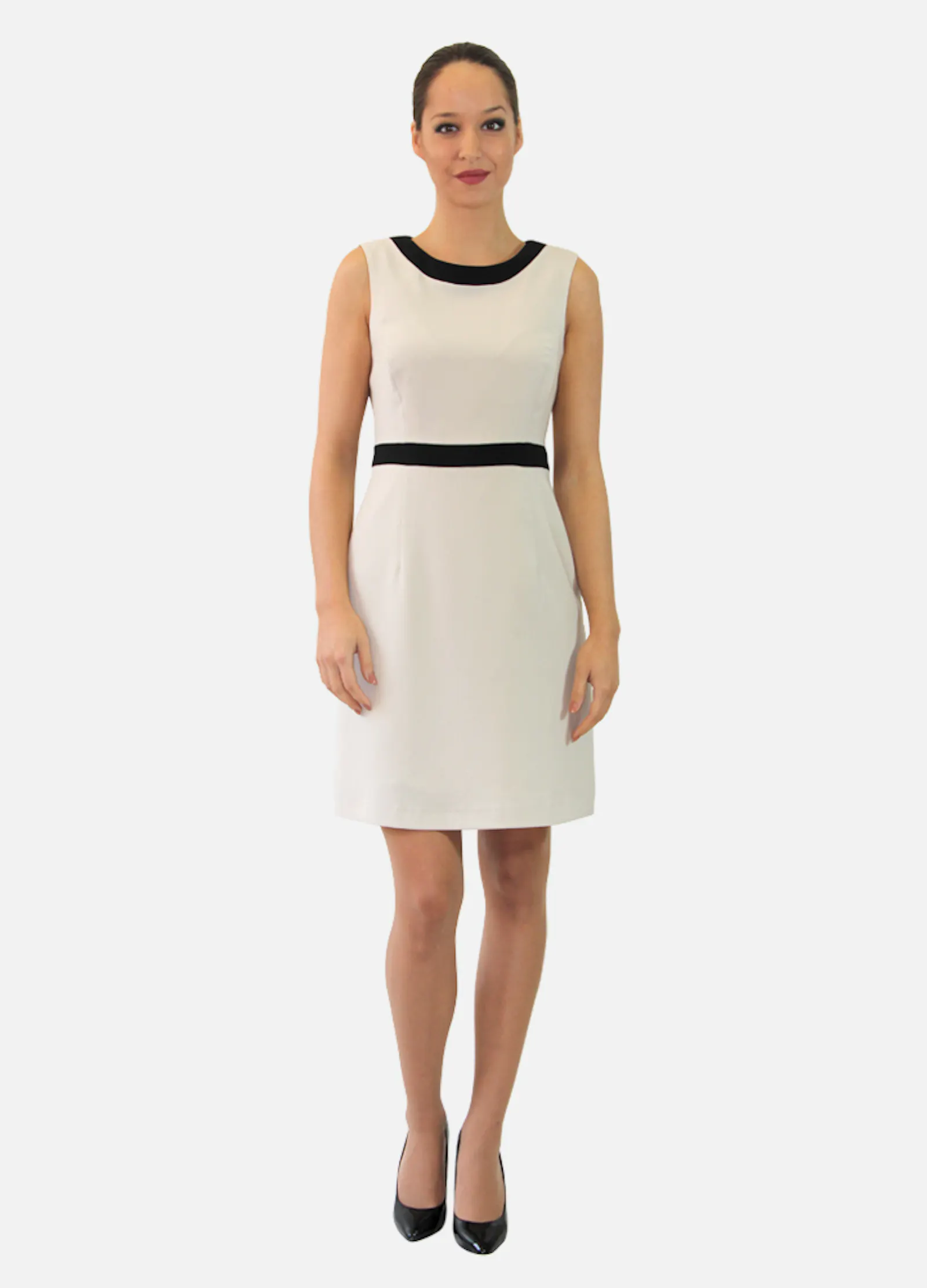 - Robe écru ajustée, bi-matière, sans manches. Col rond noir et ceinture effet satin. Fermeture zippée dans le dos.