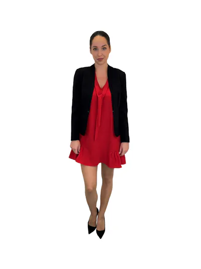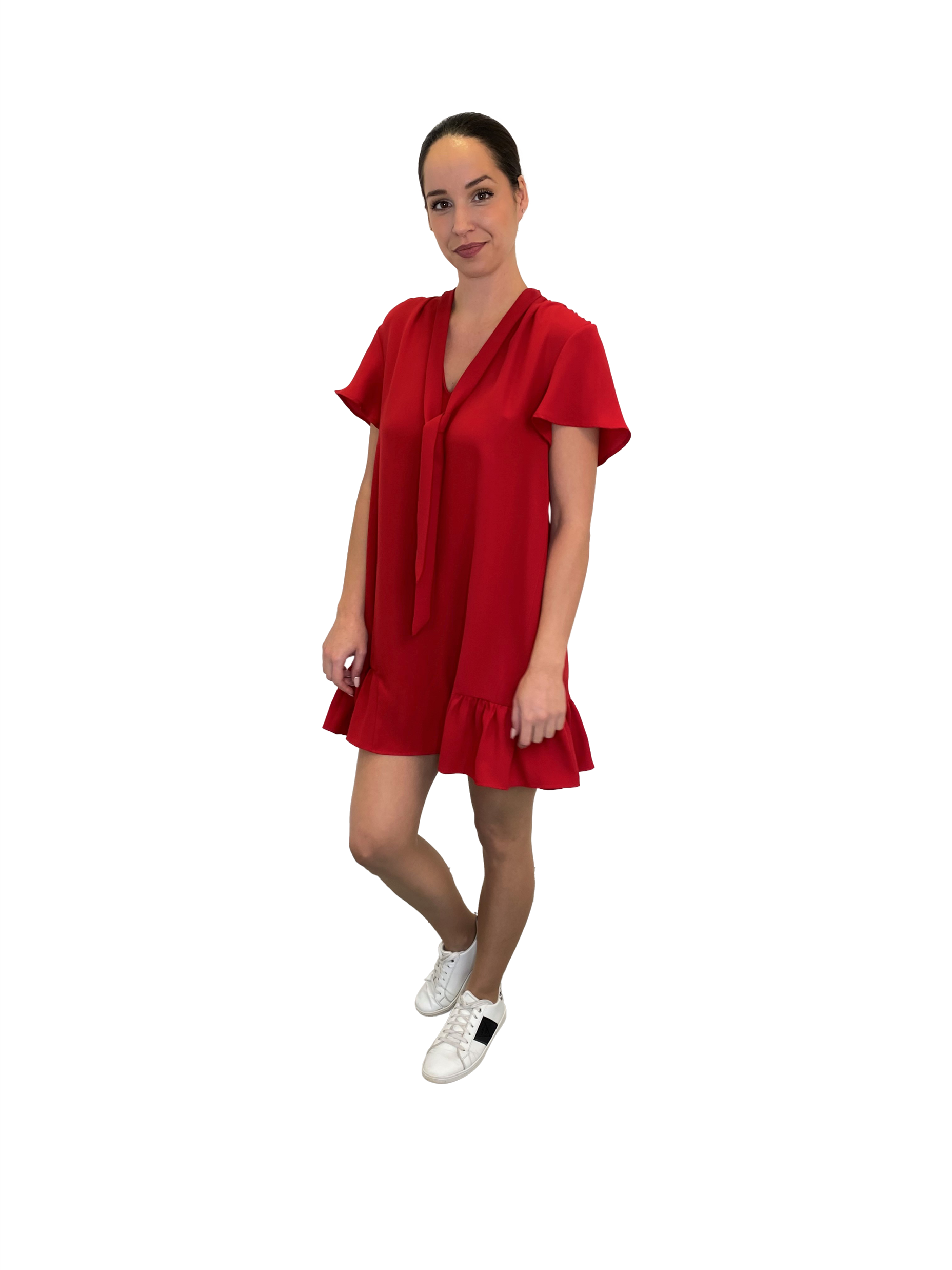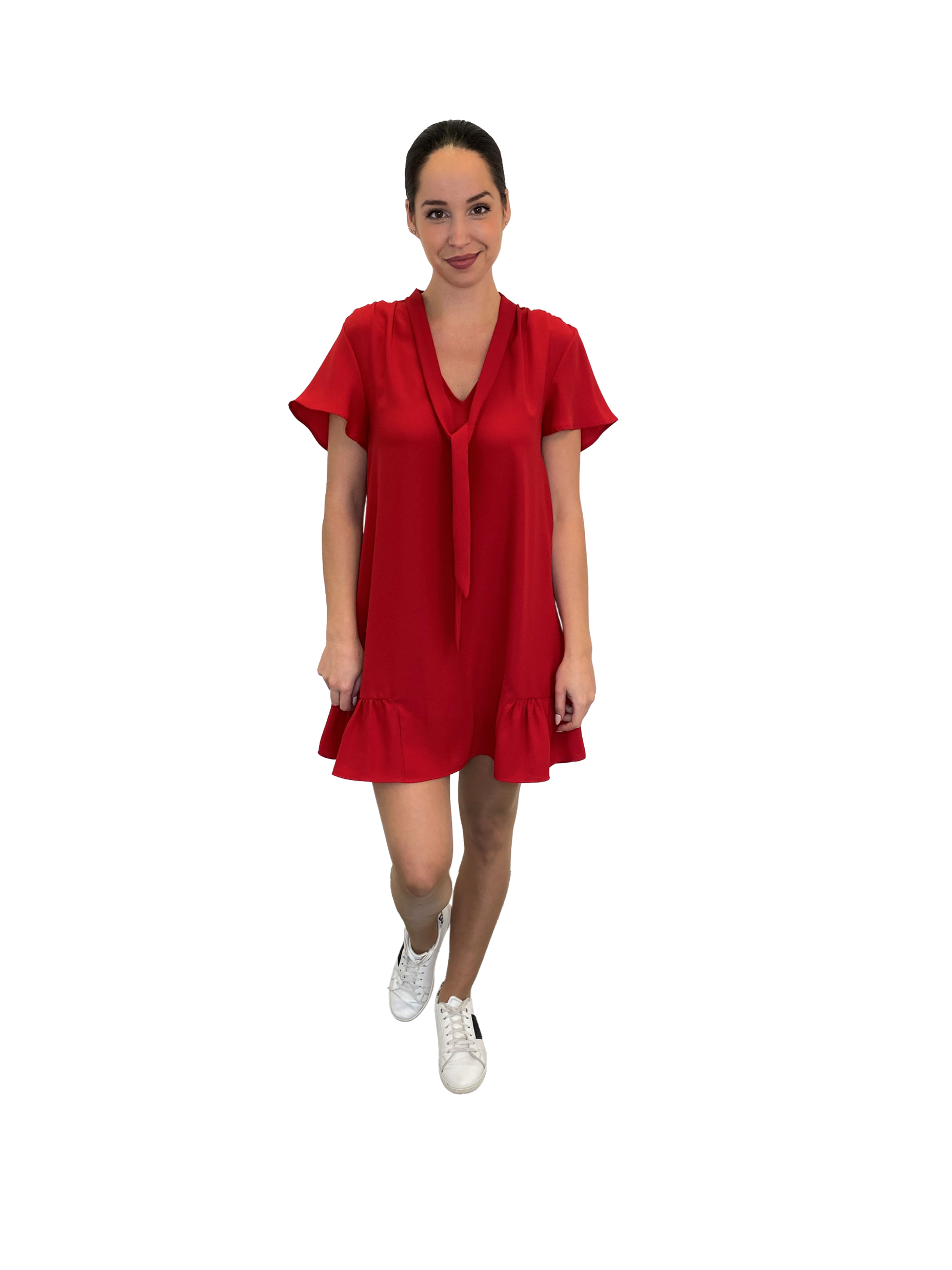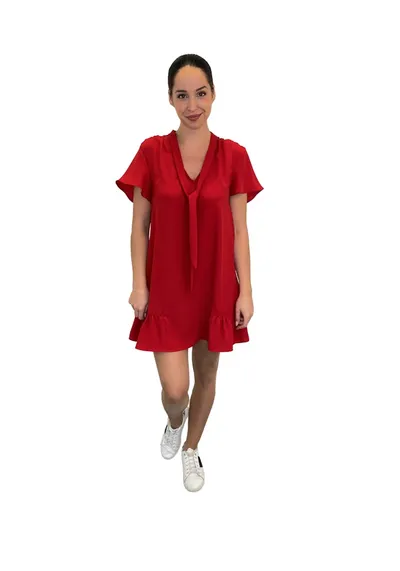 • Robe rouge légère et fluide, coupe trapèze, petites manches et col V