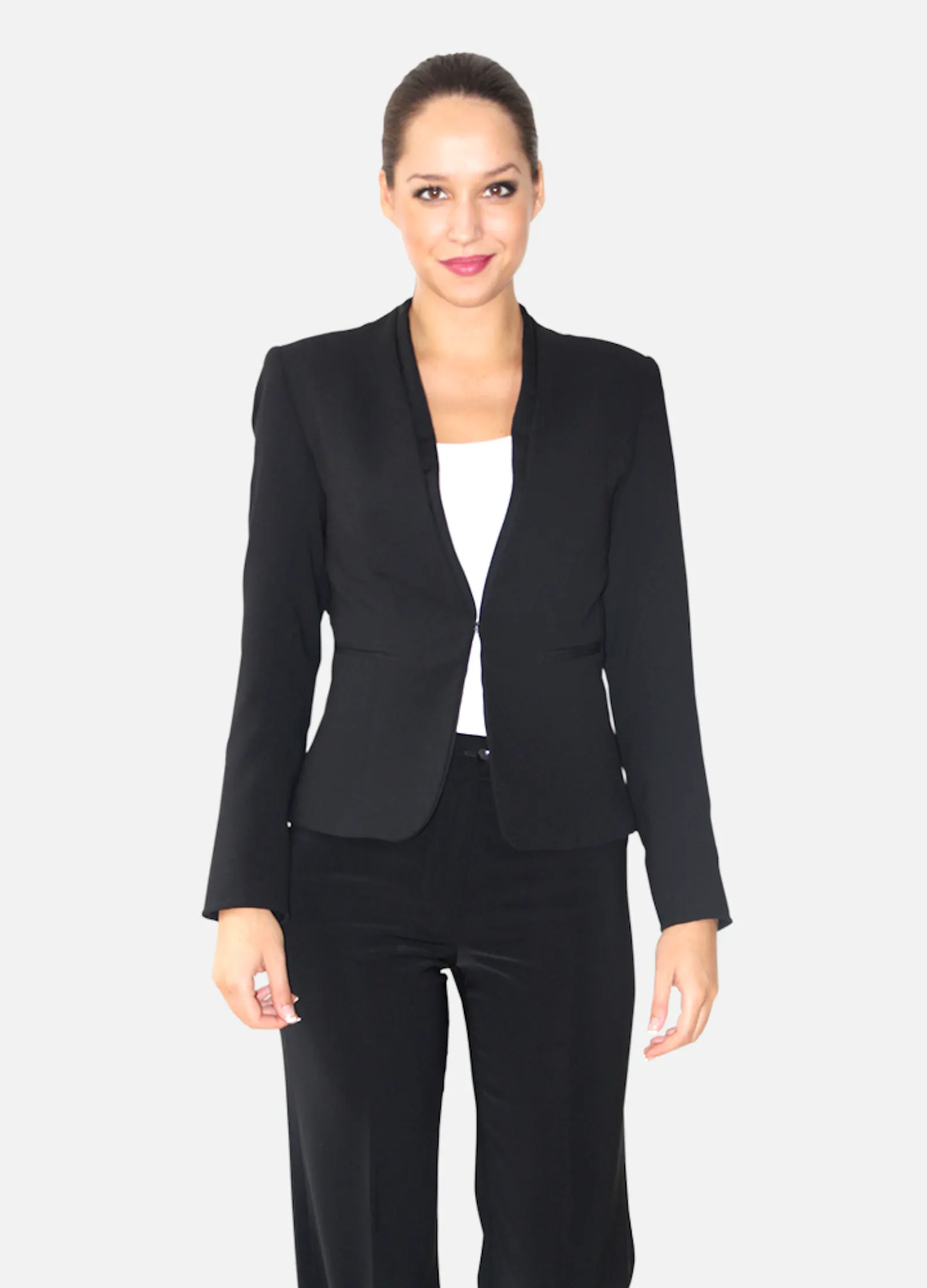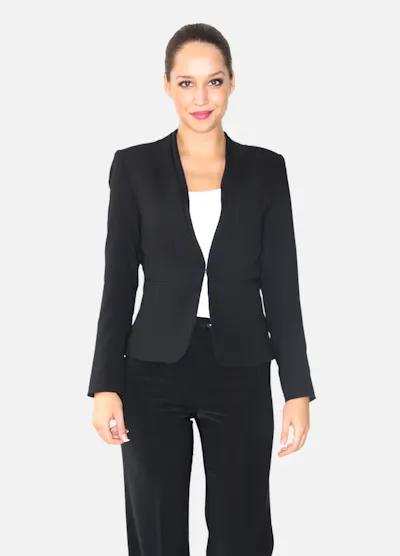 • Veste noire sans col, poches passepoilées, fermeture crochet, détails effet satin.