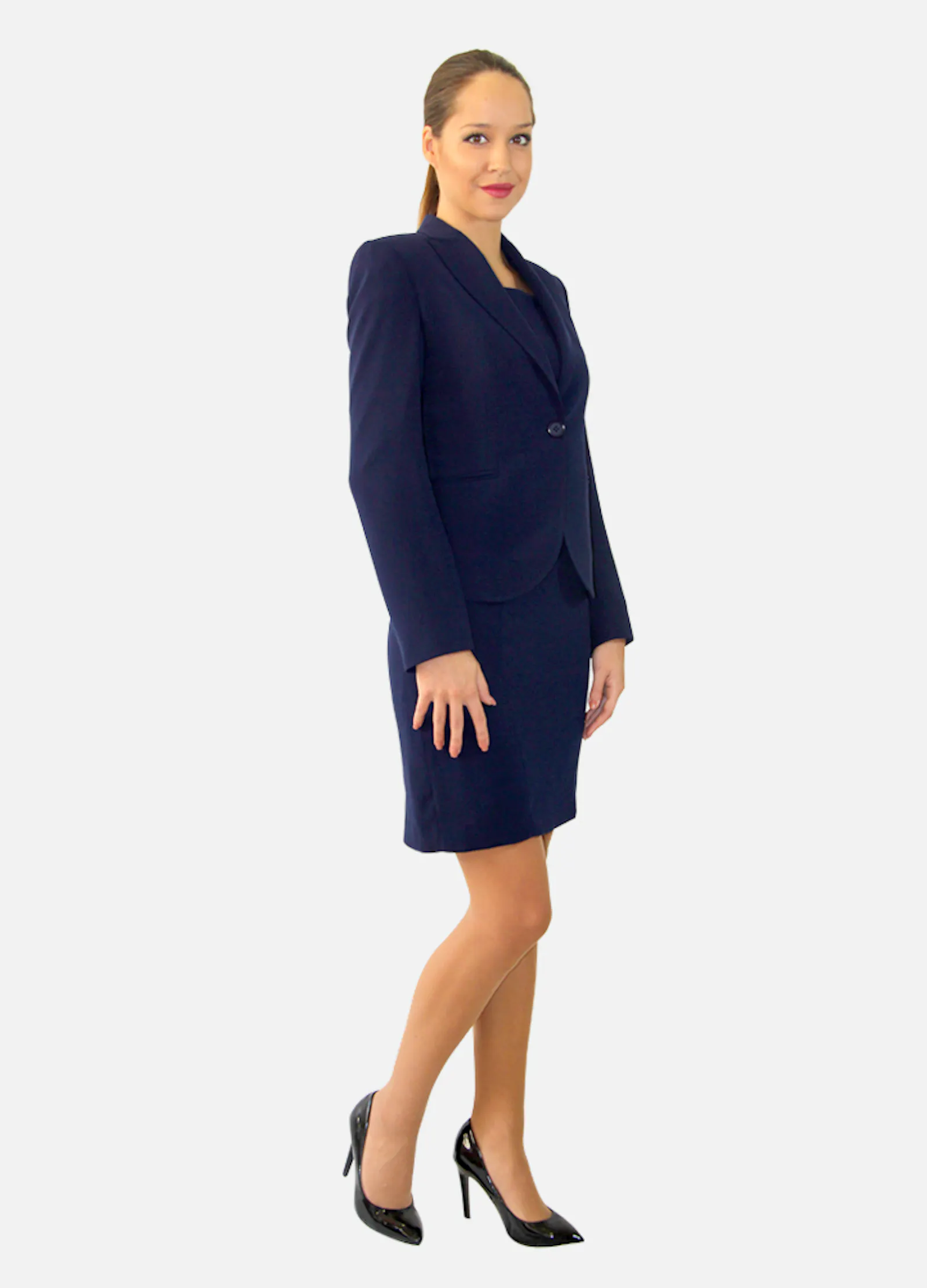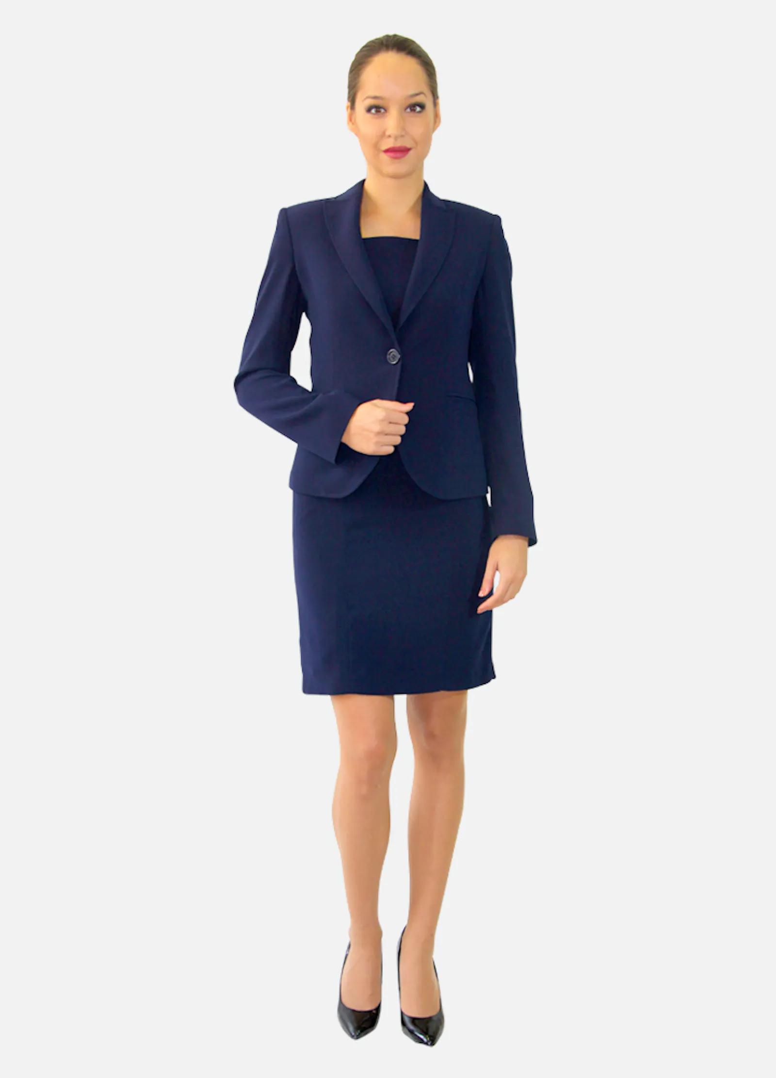 • Robe marine droite au-dessus du genou, fermeture zippée dans le dos.