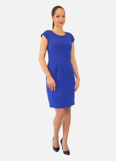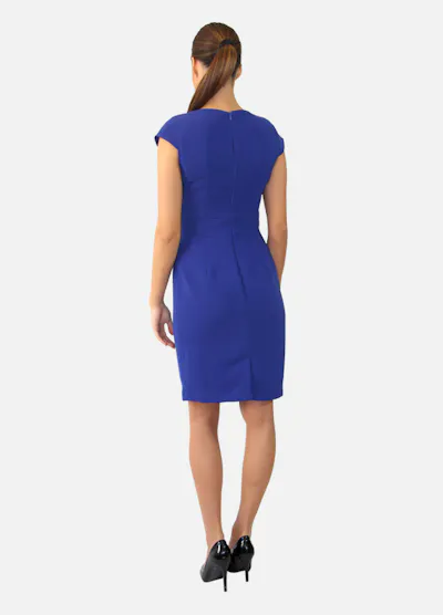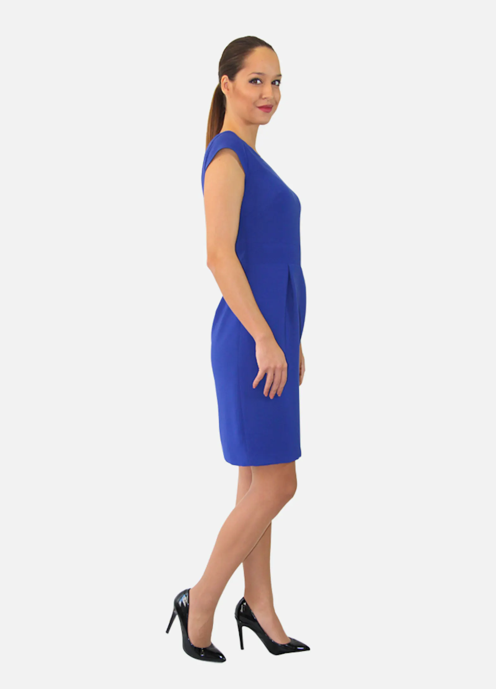 • Robe bleu électrique ajustée à petites manches, col rond. 2 pinces à l’avant et l’arrière. Fermeture zippée dos.