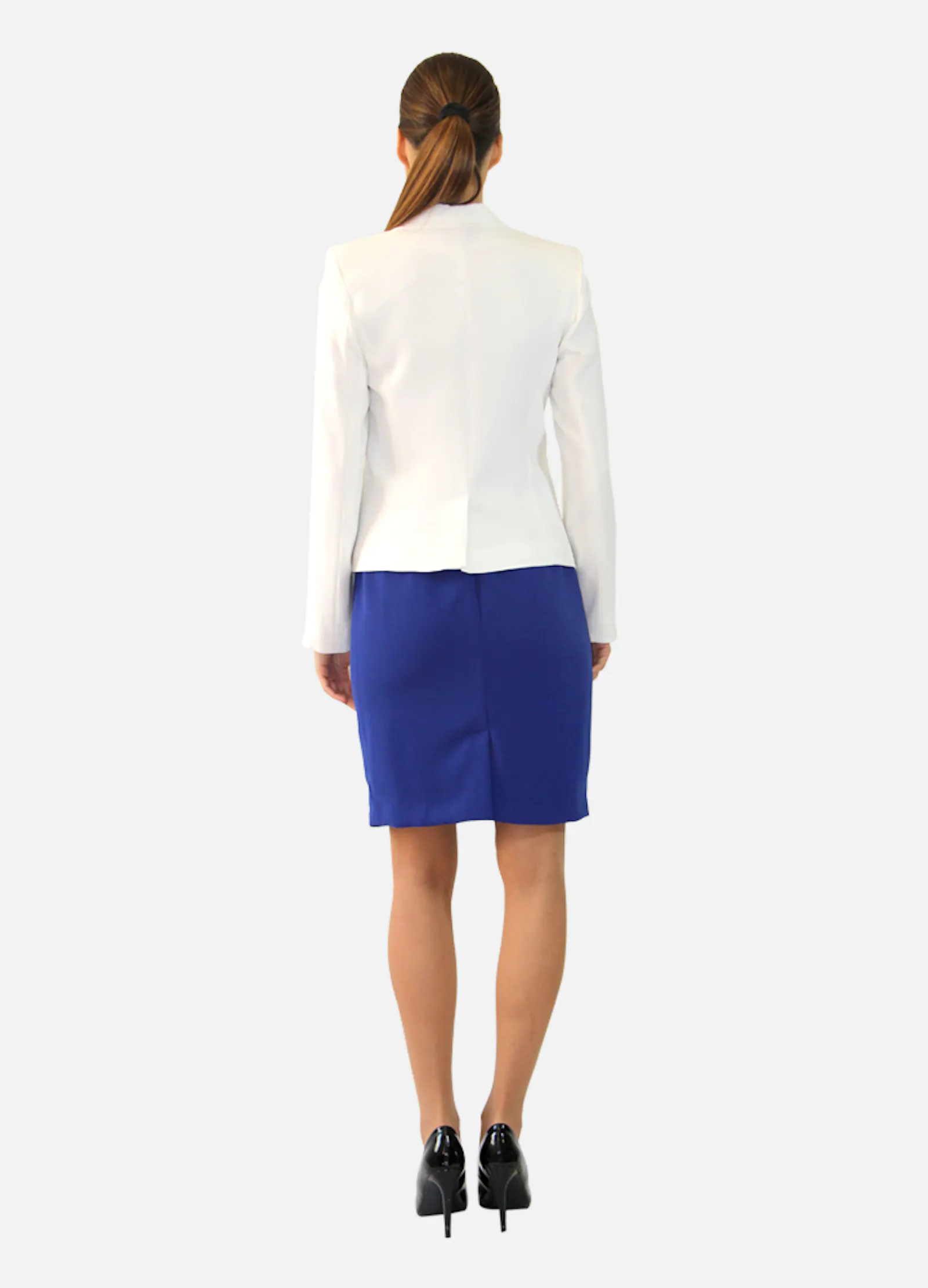 • Veste blanche cintrée, deux poches passepoilées. Fermeture un bouton.