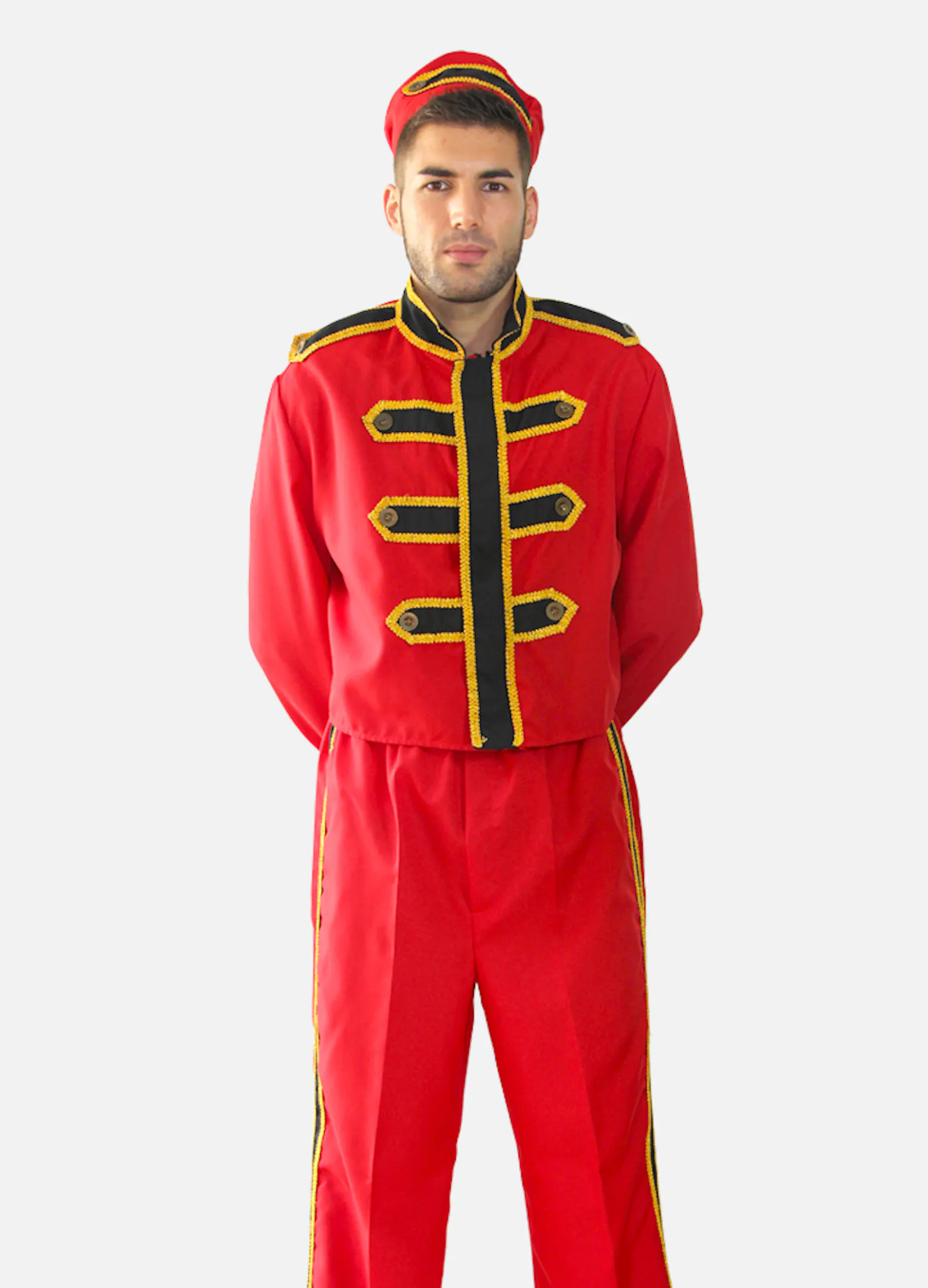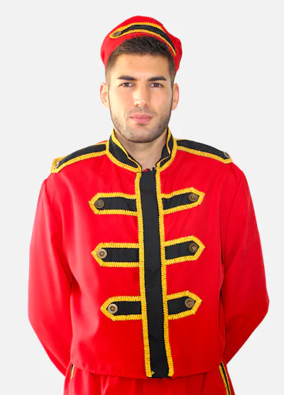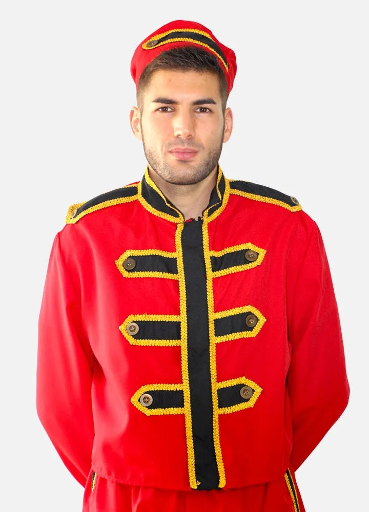 • Ensemble groom composé d’une veste courte typique de couleur rouge et noire avec bordures dorées.