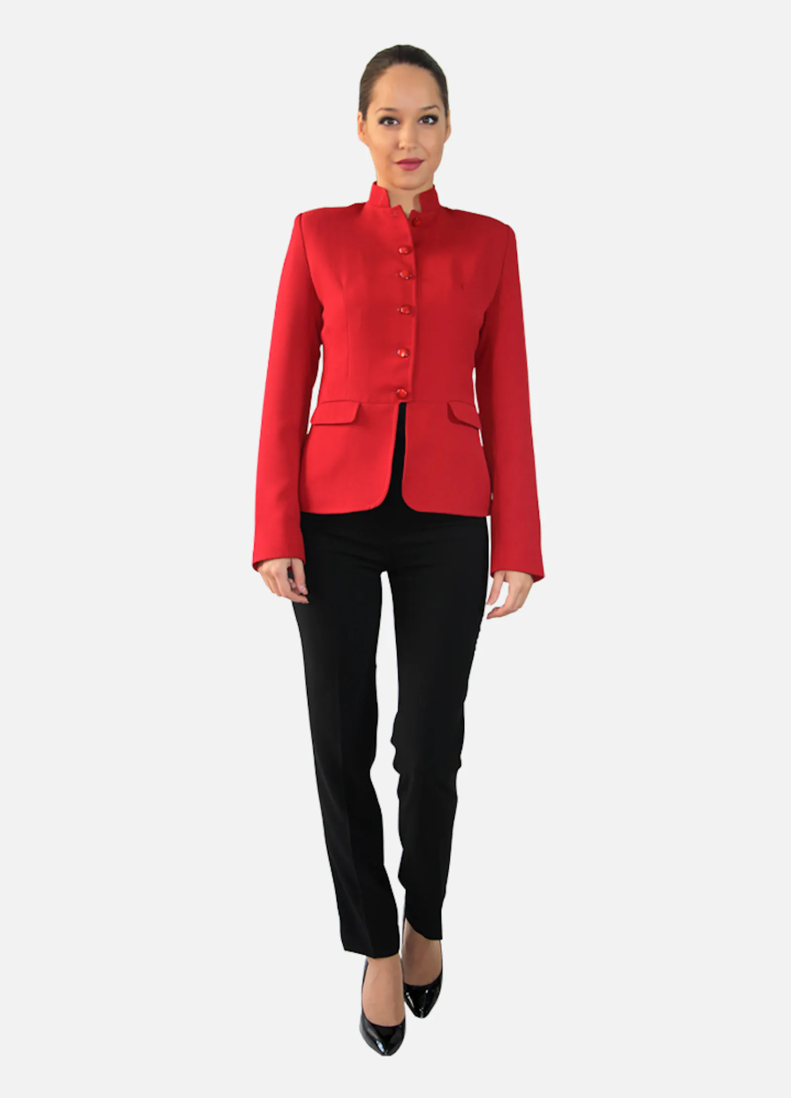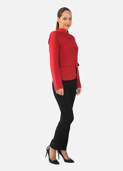 • Veste rouge col Mao, manches longues, fermeture boutonnée, 2 poches passepoilées sous rabat.