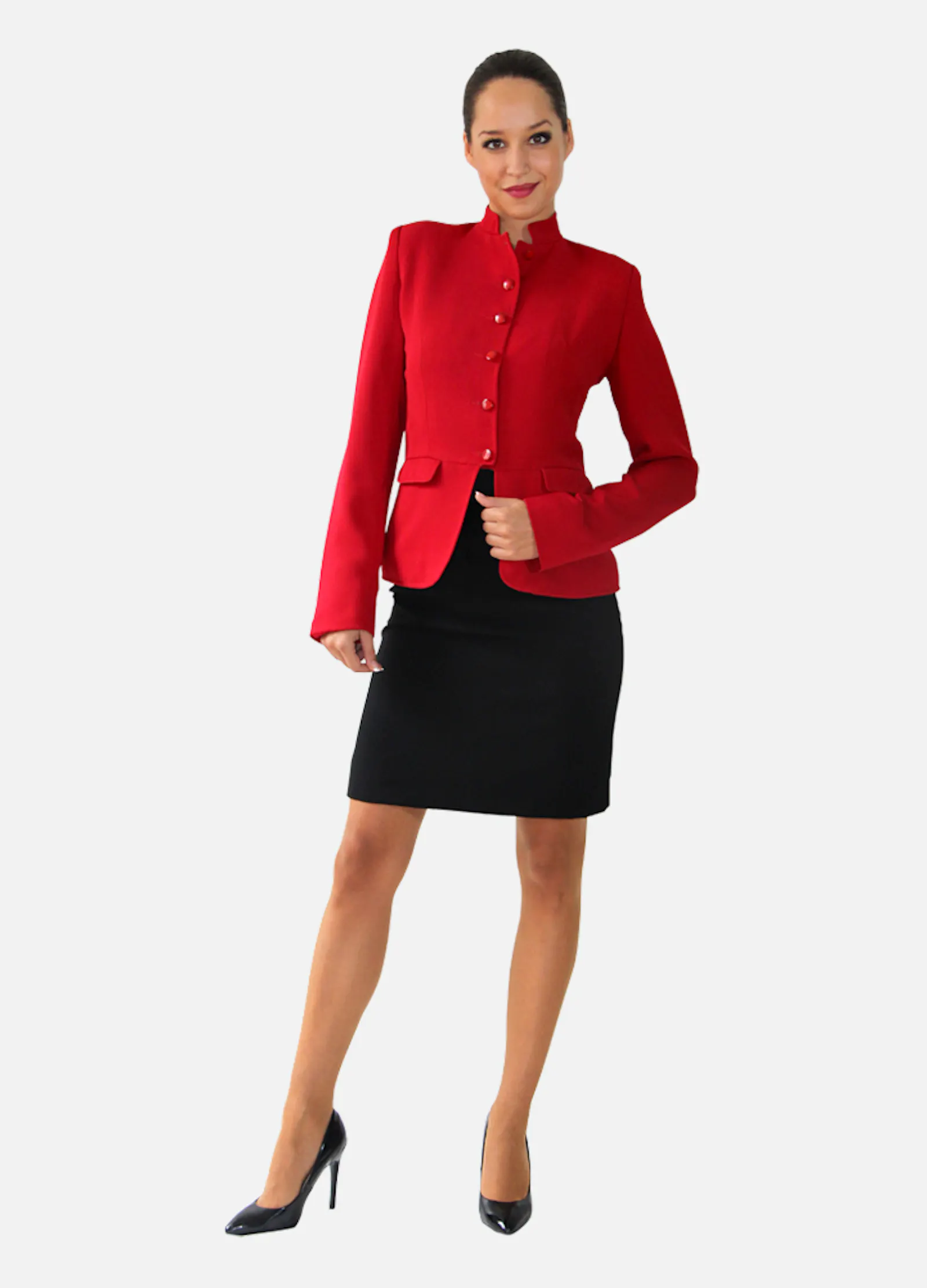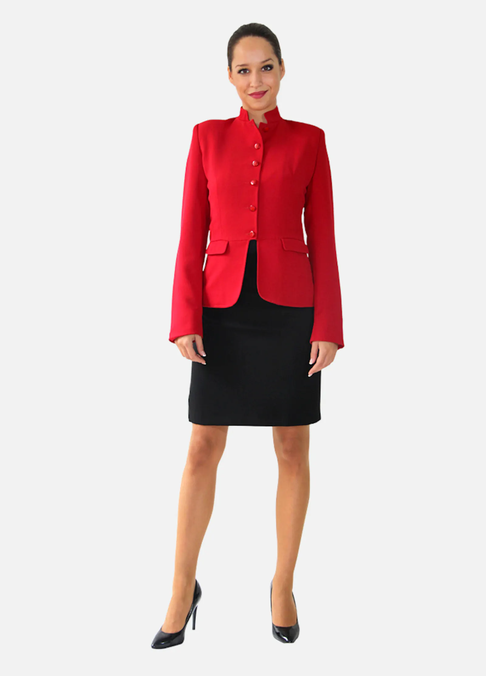 • Veste rouge col Mao, manches longues, fermeture boutonnée, 2 poches passepoilées sous rabat.