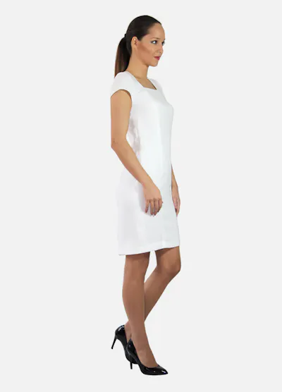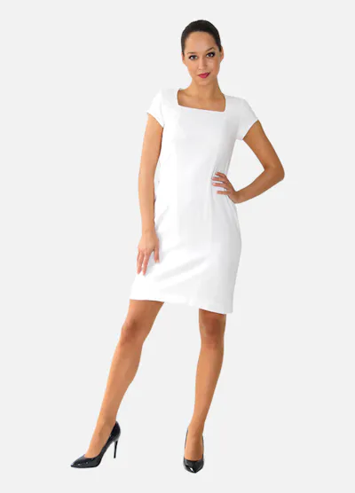 • Robe blanche droite au-dessus du genou, fermeture zippée dans le dos.