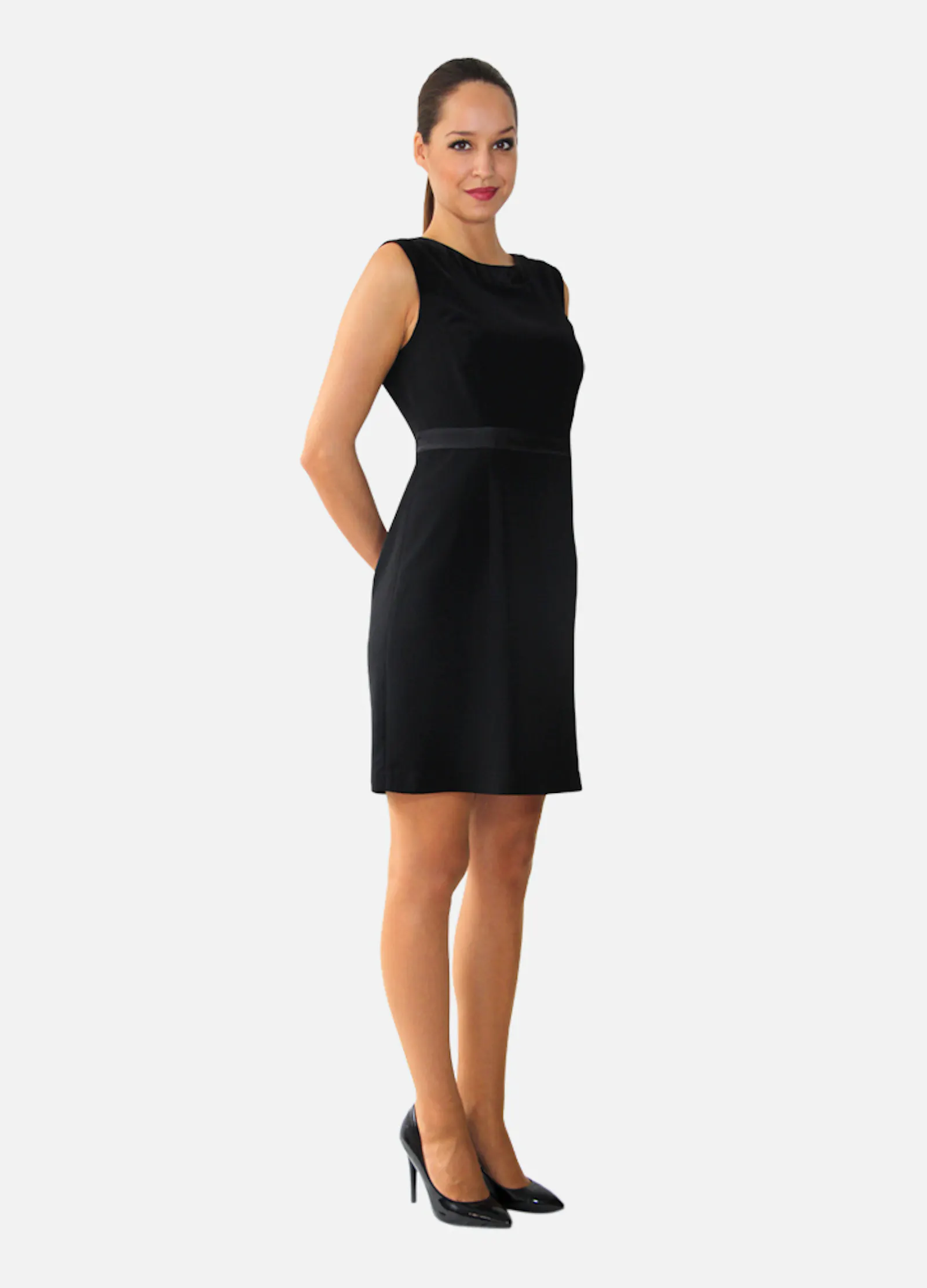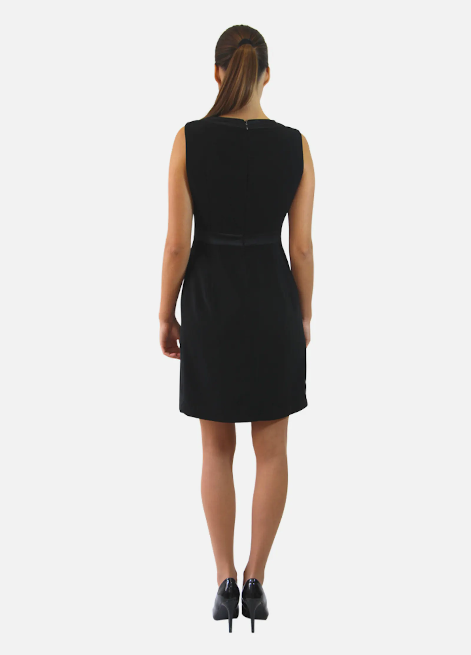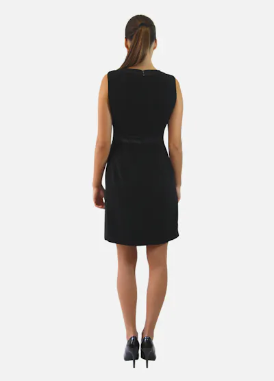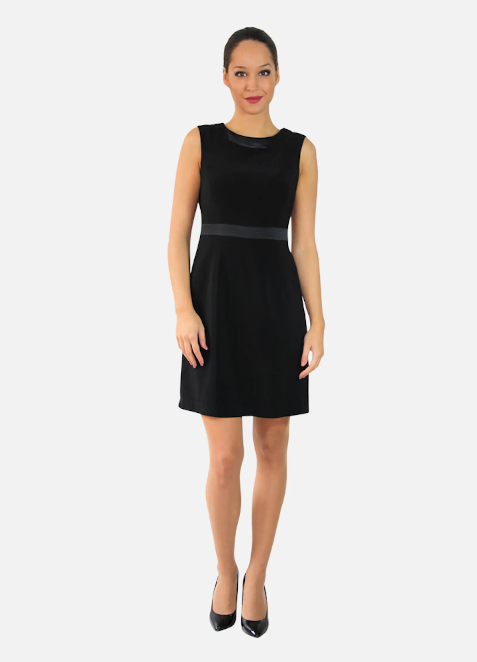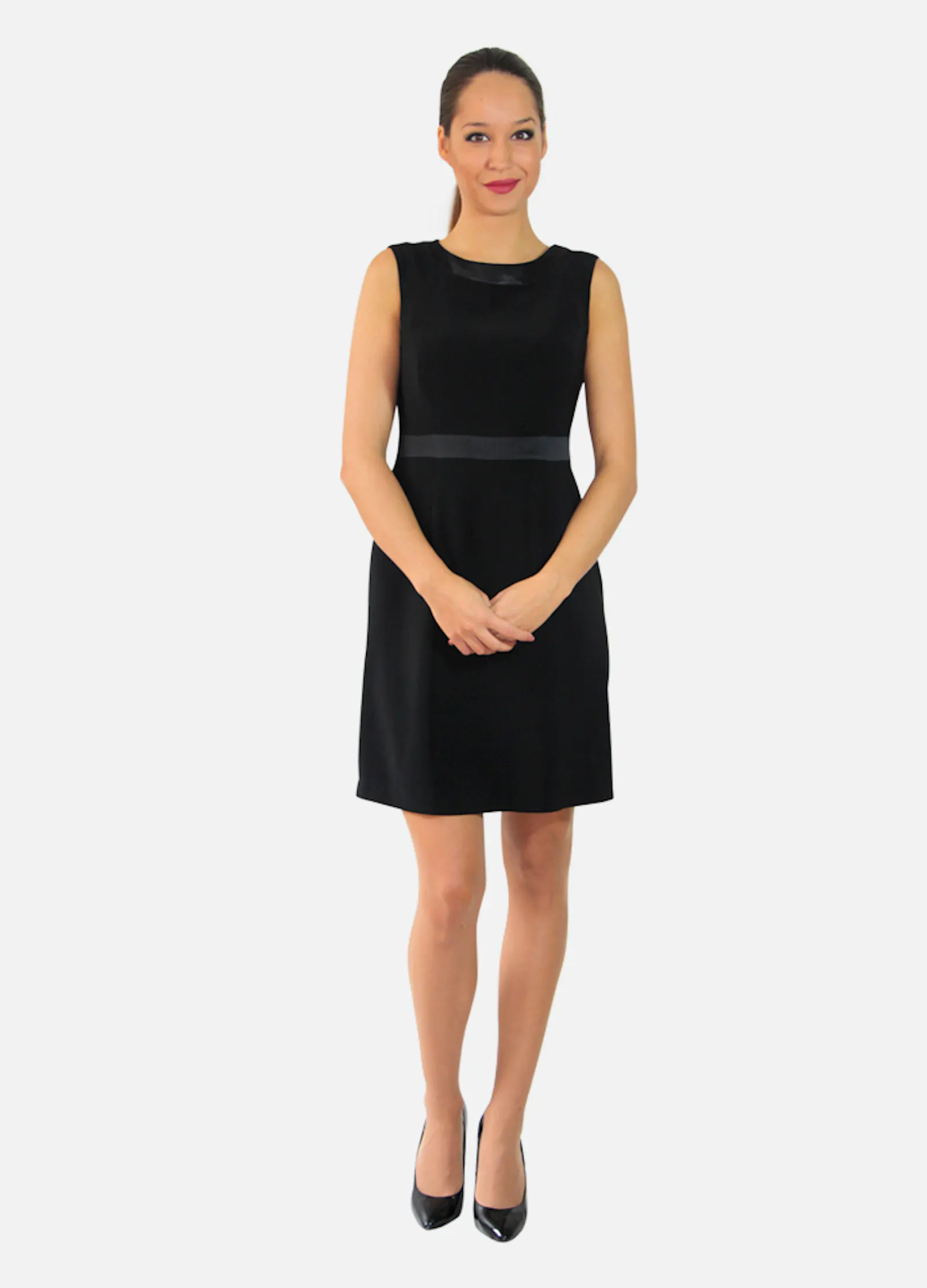 • Robe noire ajustée, bi-matière, sans manches, coupe légèrement en trapèze.