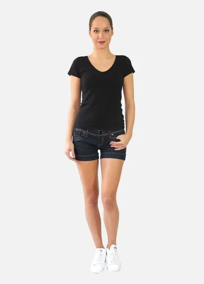 • Short en jean, coloris brut. Taille très basse, revers sur les cuisses. Fermeture zippée.