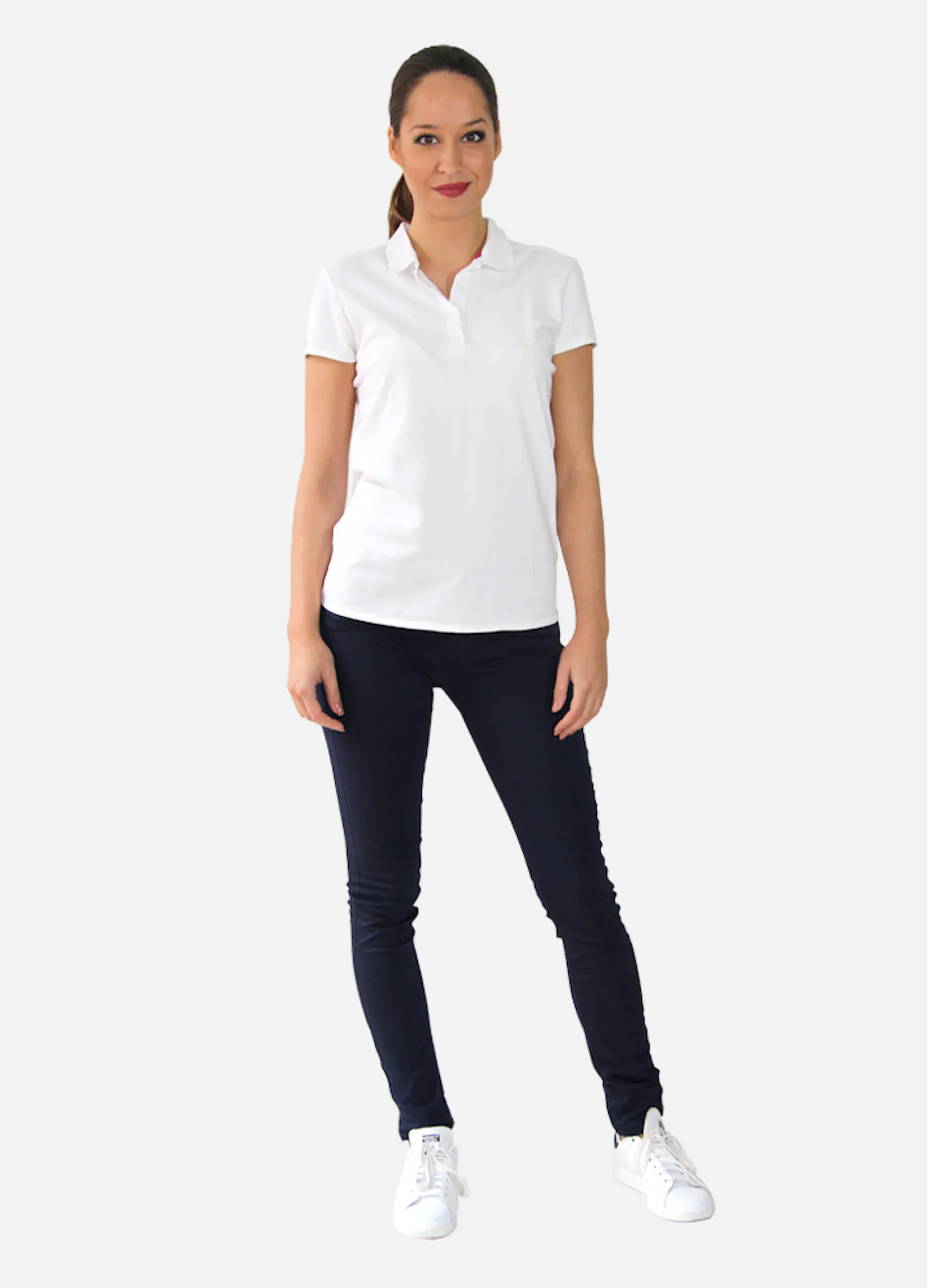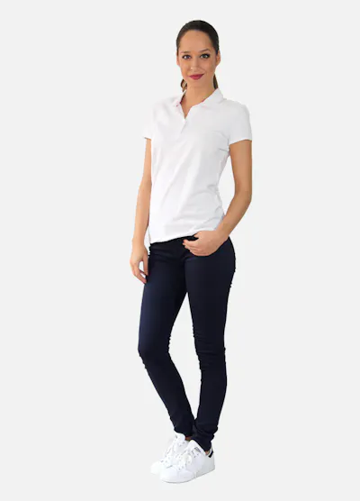 • Pantalon slim bleu marine. Fermeture zippée et bouton à la taille, ceinture à passants.
