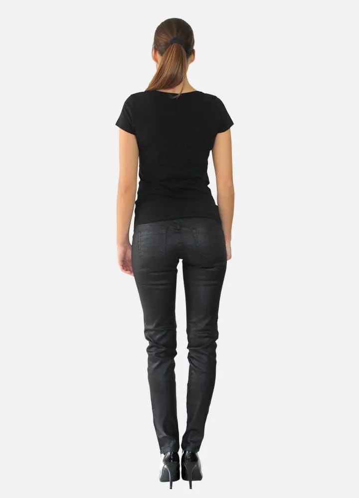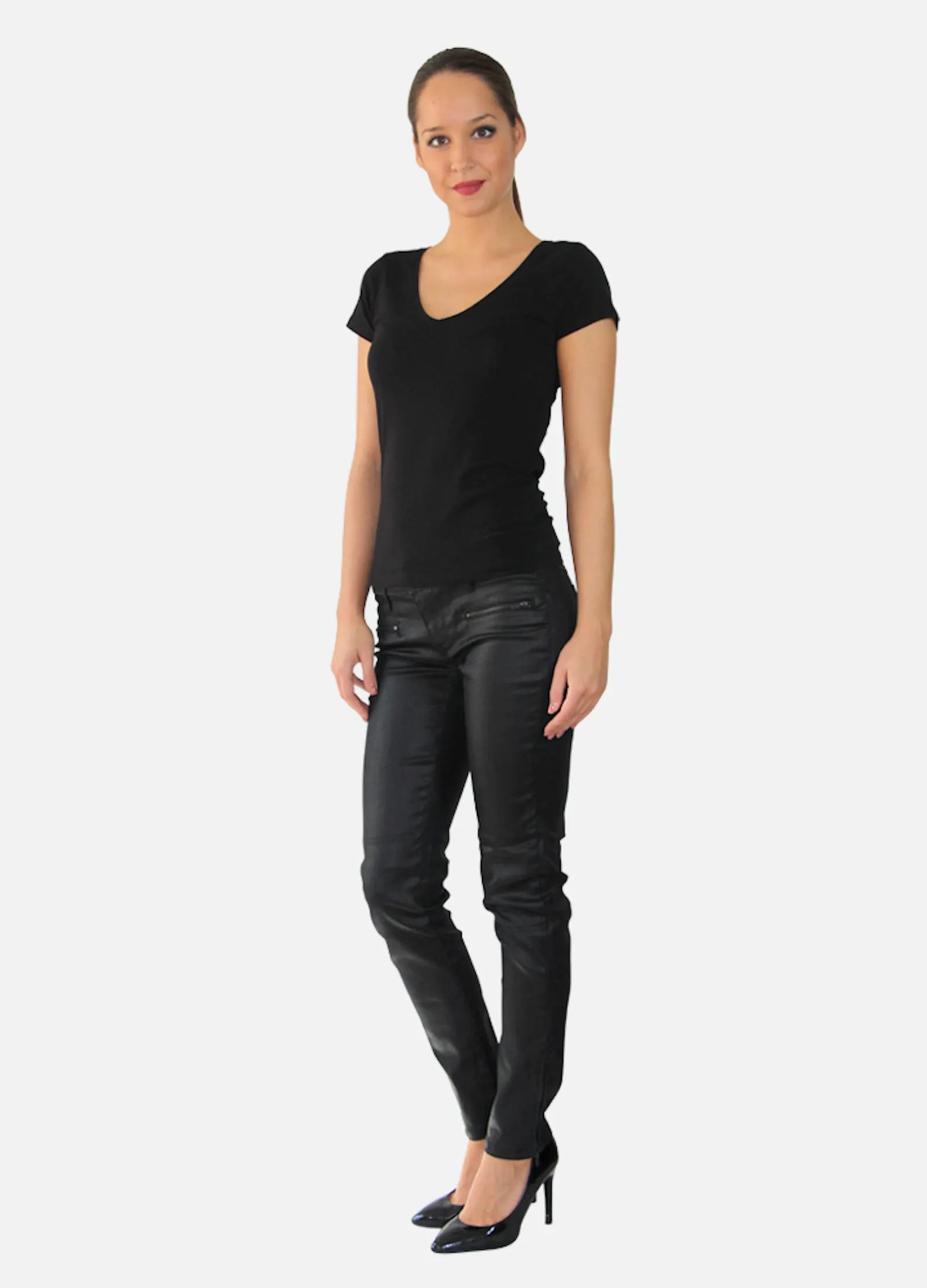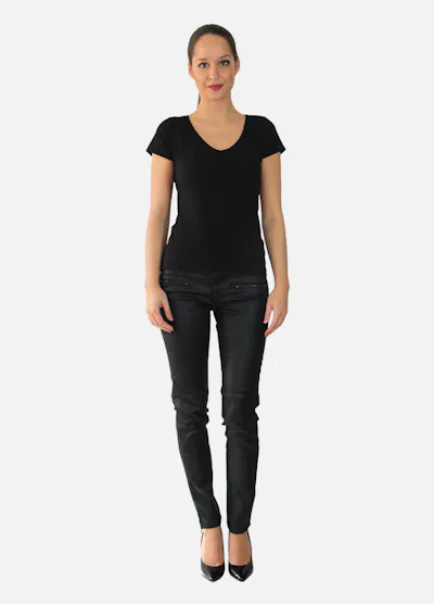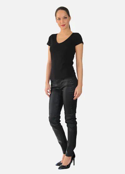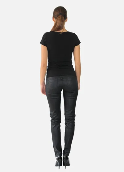 • Pantalon slim noir ajusté, effet huilé, ceinture à passants, poches devant zippées.