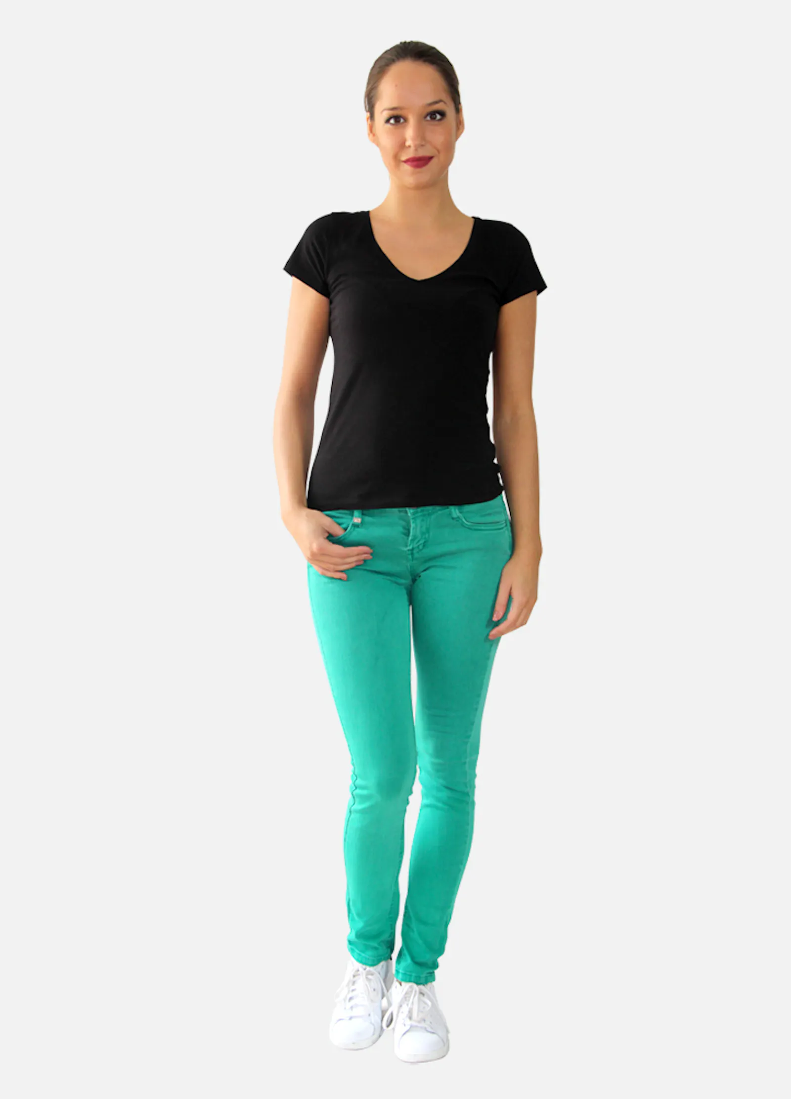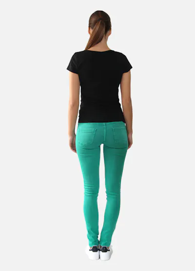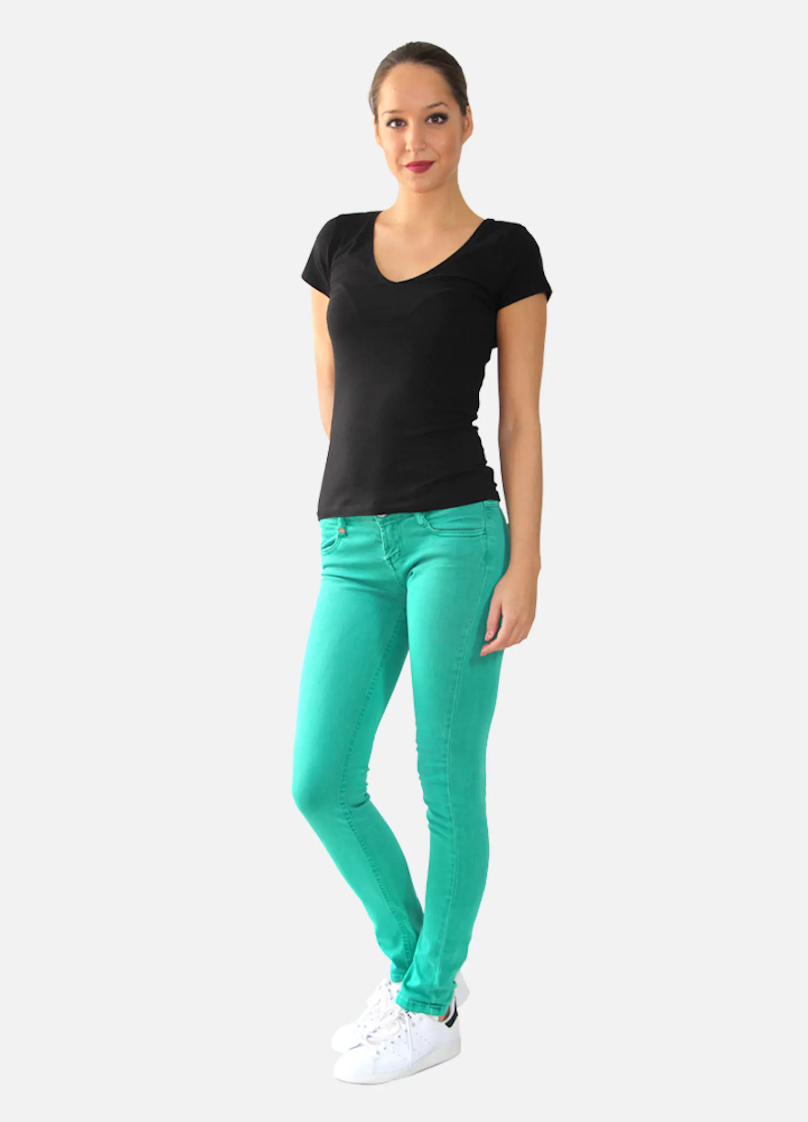 • Pantalon slim vert clair. Fermeture zippée et bouton à la taille, ceinture à passants.