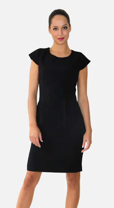 - Robe noire ajustée à petites manches, col rond. 2 pinces à l’avant et l’arrière. Fermeture zippée dos.