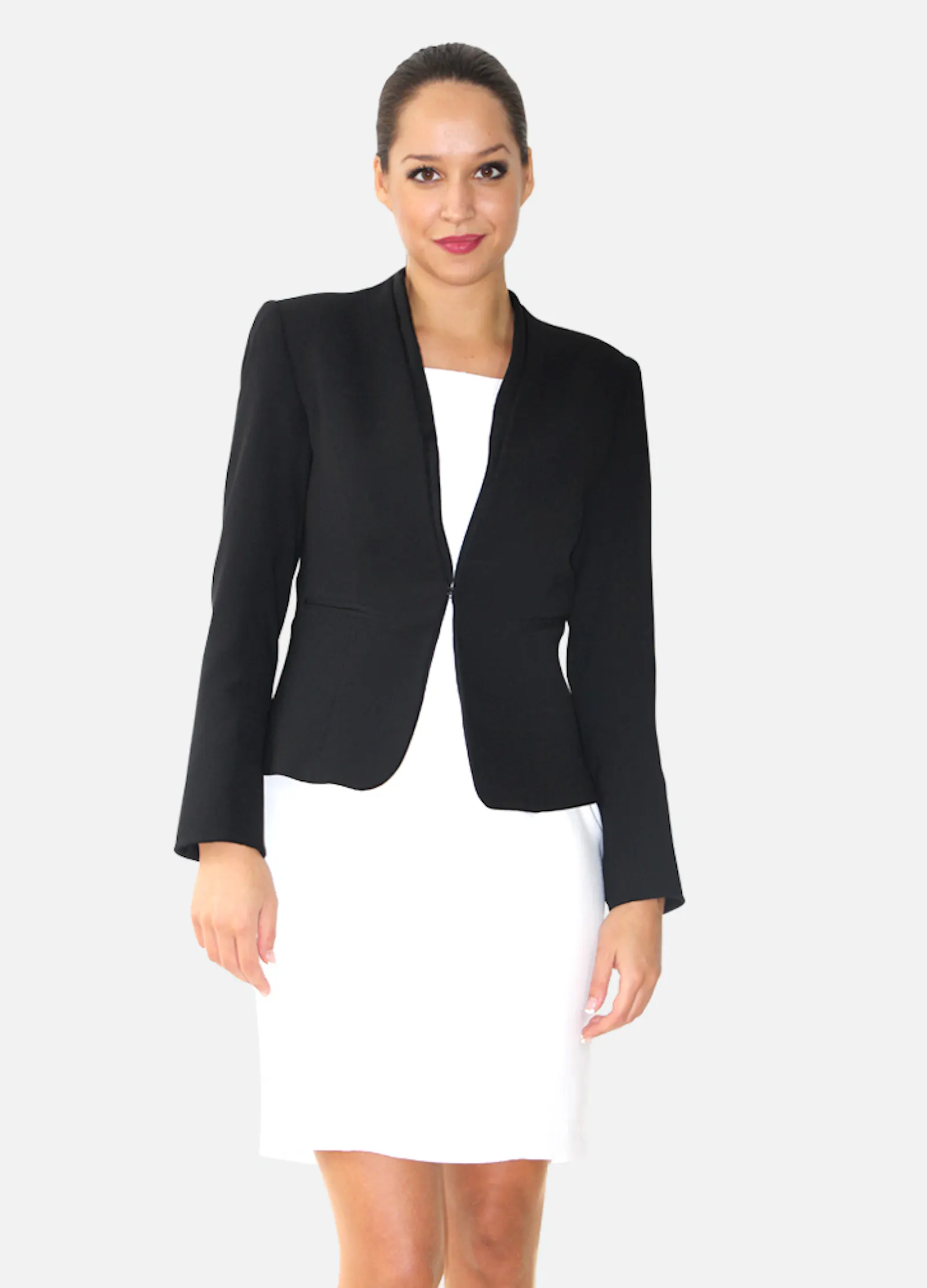 • Veste noire sans col, poches passepoilées, fermeture crochet, détails effet satin.
