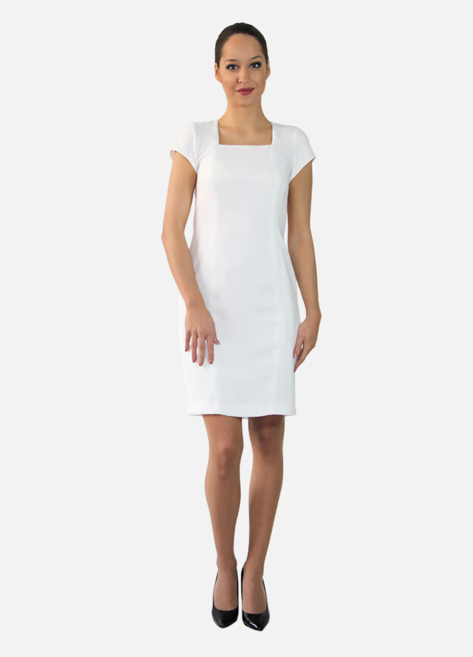 • Robe blanche droite au-dessus du genou, fermeture zippée dans le dos.